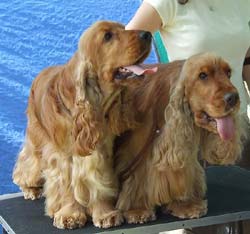 Liege 26.7.09: Jim und Jill "vielversprechend 1", Jack vielversprechend 2 hinter Jim. Jim wird "Meilleur Chiot (Cocker anglais)" und ist im Ehrenring unter den 5 besten Welpen aller Rassen. Frosty wie gewohnt V1.