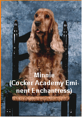 Her progeny that have been exhibited have won well, more importantly she has produced sound healthy typical stock who in turn are producing the true Cocker type included her three golden daughters "Minnie" (Cocker Academy Eminent Enchantress),